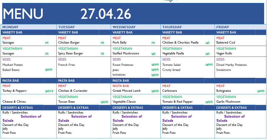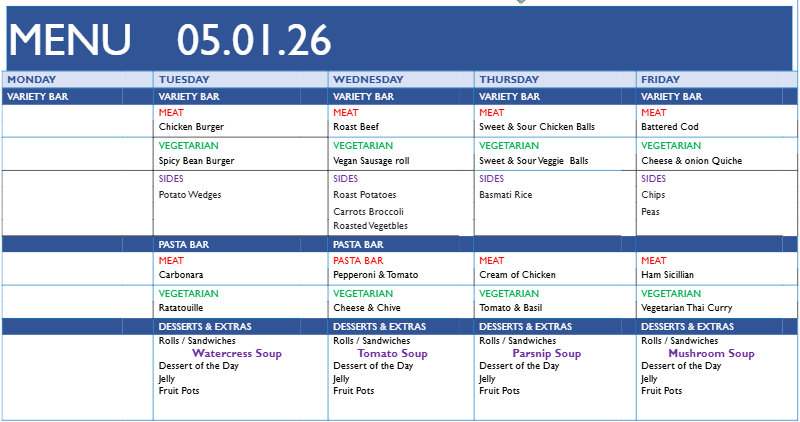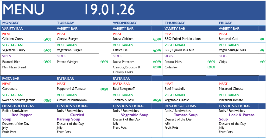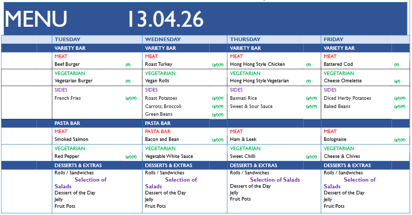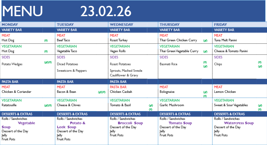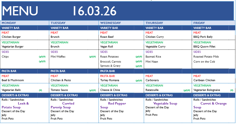 Students eligible for free school meals will have a daily allowance which they can use for one break time snack or a hot drink and lunch (a main meal, a pasta meal or sandwich/roll and crisps). 'Breaktime specials' and cold drinks are excluded and will only be served if additional credit has been added by parents/carers via the ParentPay account (see below).